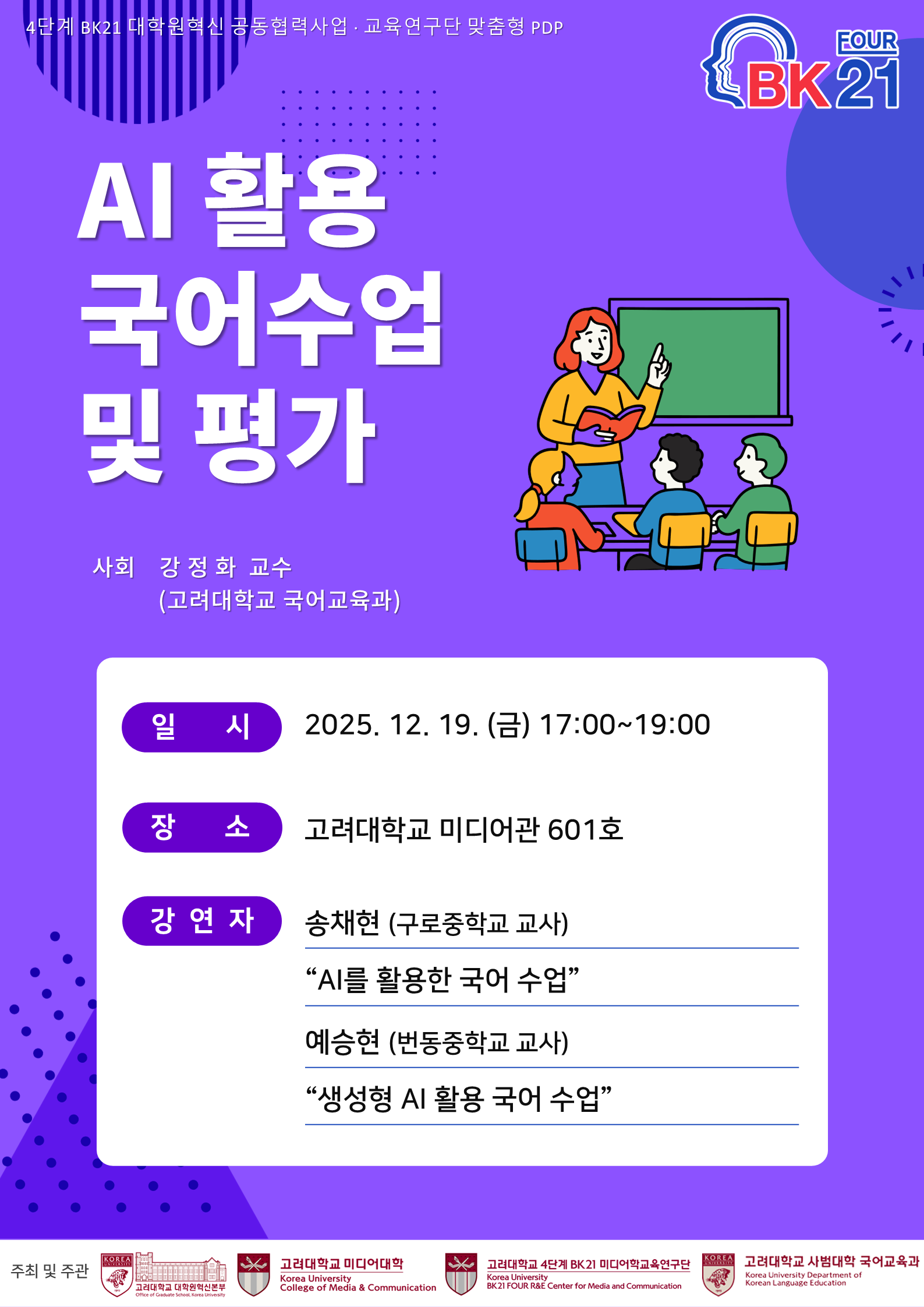AI 활용 국어수업 및 평가 관련 특강을 개최하오니 학생 여러분의 많은 참석 부탁드립니다. 1. 일시: 2025.12.19.(금) 17:00–19:00 2. 장소: 고려대학교 미디어관 601호 3. 강연자: 송채현(구로중학교 교사), 예승현(번동중학교 교사) 4. 신청: https://forms.gle/1EshEwjrYjDz677X7 **신청 기간: 2025.12.15.(월) 오전 10:00까지 5. 문의: fluxus15@naver.com
