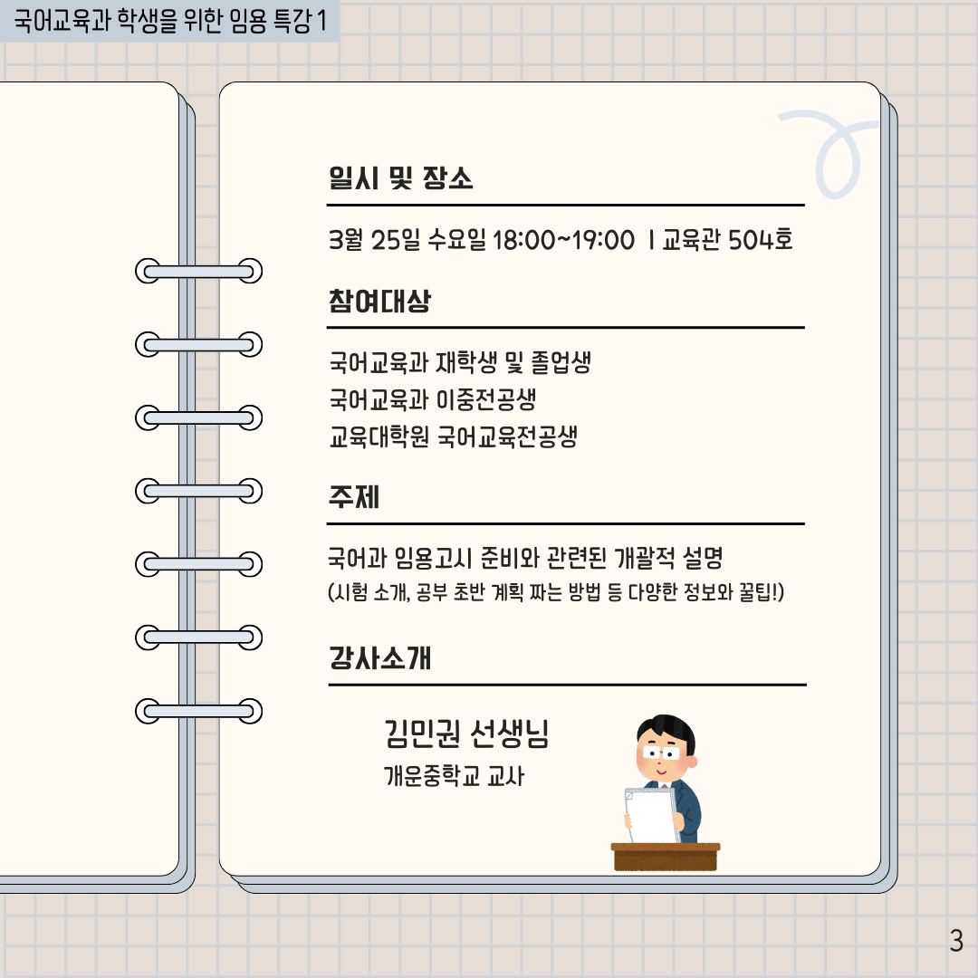 국어교육과에서 아래와 같이 특강을 개최하오니 학생 여러분의 많은 참석 부탁드립니다. 1. 일시: 2026년 3월 25일 (수) 18:00~19:00 2. 장소: 운초우선교육관 504호 3. 강사: 김민권 선생님(개운중학교) 4. 강의주제: 국어과 임용고시 준비와 관련된 개괄적 설명 5. 신청 링크: https://forms.gle/yF8zkhUE4DBTVKiJ6 문의) 국어교육과 사무실 02-3290-2340