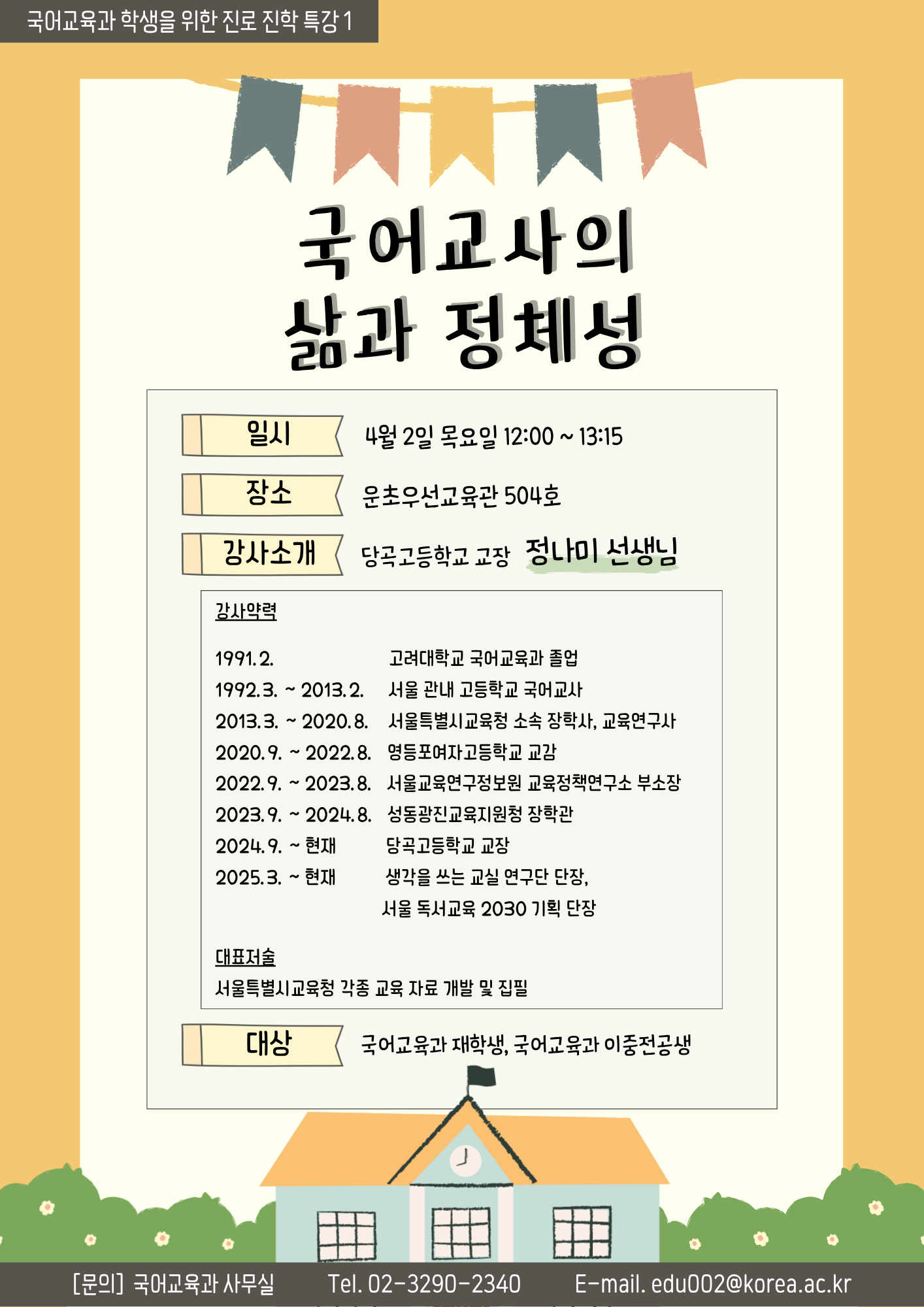 국어교육과에서 아래와 같이 특강을 개최하오니 학생 여러분의 많은 참석 부탁드립니다. 1. 일시: 2026년 4월 2일 (목) 12:00~13:15 2. 장소: 교육관 504호 3. 강사: 정나미 선생님(당곡고등학교 교장) 4. 강의주제: 국어교사의 삶과 정체성 문의) 국어교육과 사무실 02-3290-2340