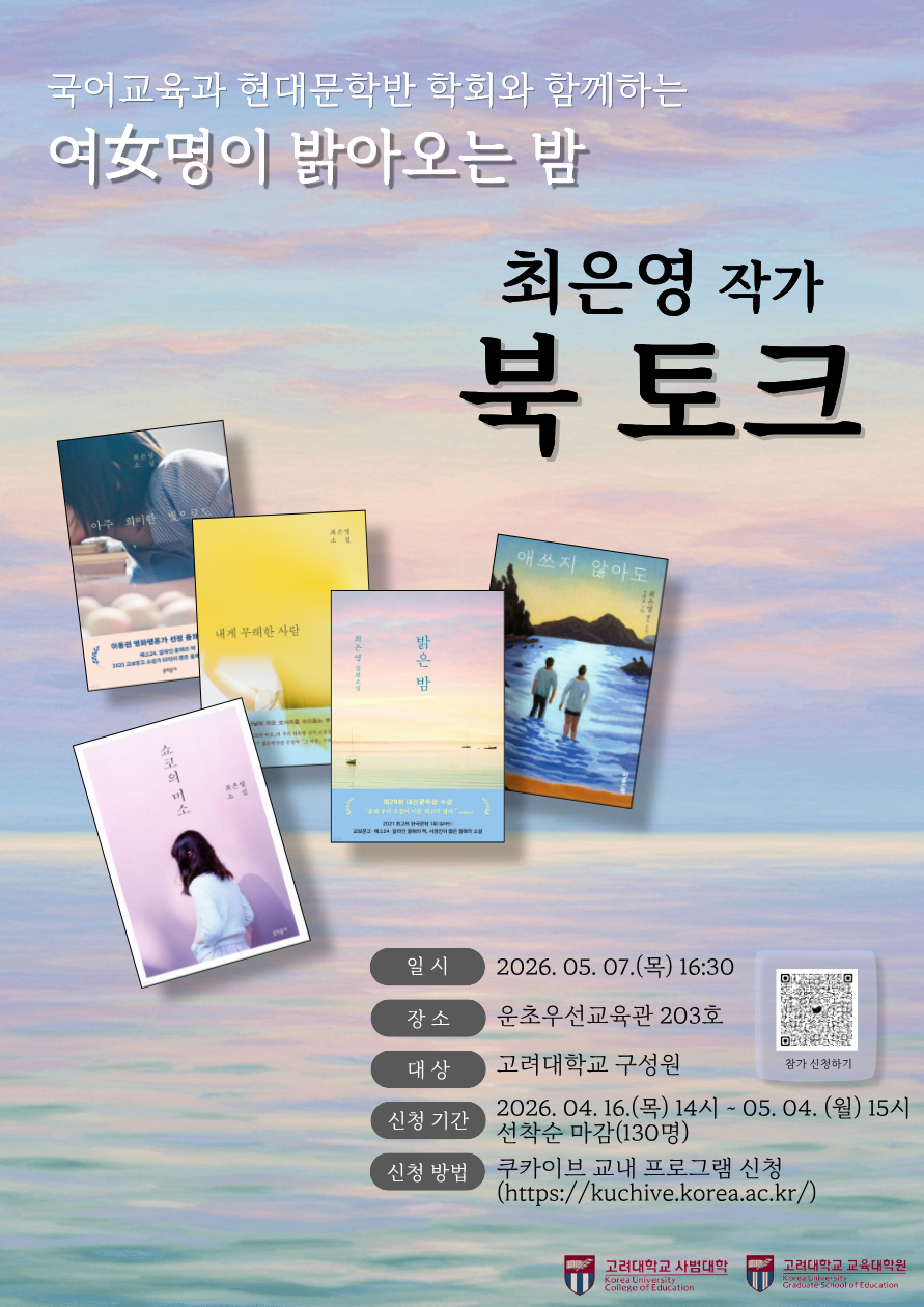 국어교육과 현대문학반 학회와 함께하는 최은영 작가 북토크가 열립니다. 많은 관심과 참여 바랍니다. 1. 일시: 2026년 5월 7일 (목) 16:30 2. 장소: 교육관 203호 3. 신청 기간: 2026년 4월 16일 (목) 14시~ 5월 4일 (월) 15시 * 선착순 마감(130명) 4. 신청 방법: 쿠카이브(https://kuchive.korea.ac.kr/) 5. 대상: 고려대학교 구성원